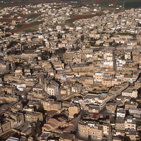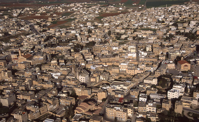Madaba from east, St. George's Church, Archaeological Park (below) and Catholic Church (left)