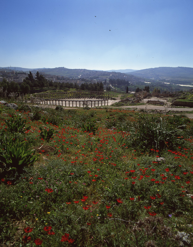 Jordan. Jerash, wilde flowers, Oval Piazza and Temple of Zeus