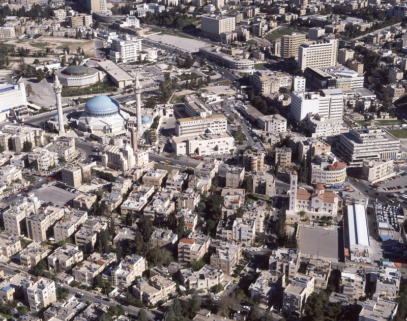 Amman, King Abdullah Mosque, two churches and city from north west