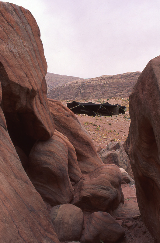 Petra, bedouin tent from outside, Petra behind