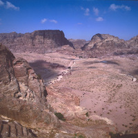 Petra basin from al-Khubtha (include back of Palace Tomb) to Qasr al-Bint and mountains behind