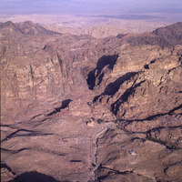 Petra basin from Jabal al-Khubtha to Qasr al-Bint, over mountains. to Wadi Araba