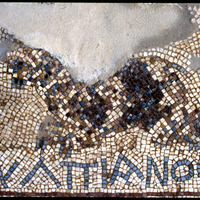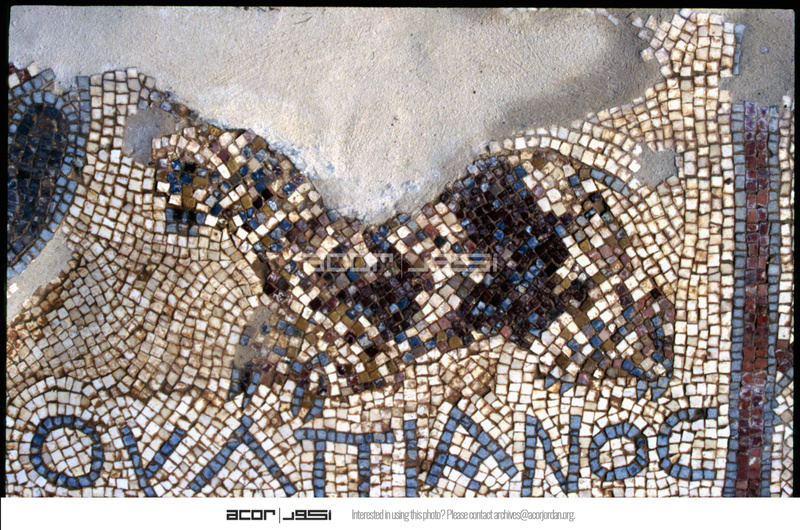 Khirbet Anab al-Kabir - detail of mosaic with inscription and defaced bird