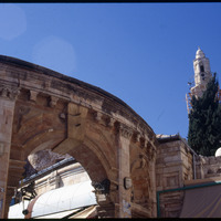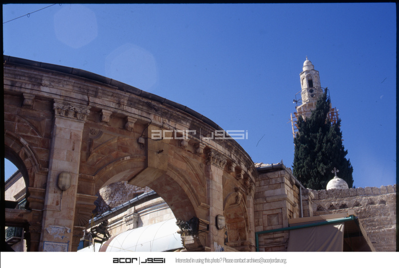 Arch at Souq Aftimos in Muristan with minaret of the Mosque of Omar in the background