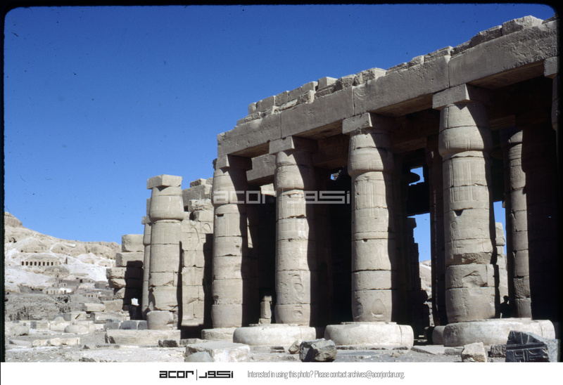Columns of Ramesseum Hypostyle Hall with village in background