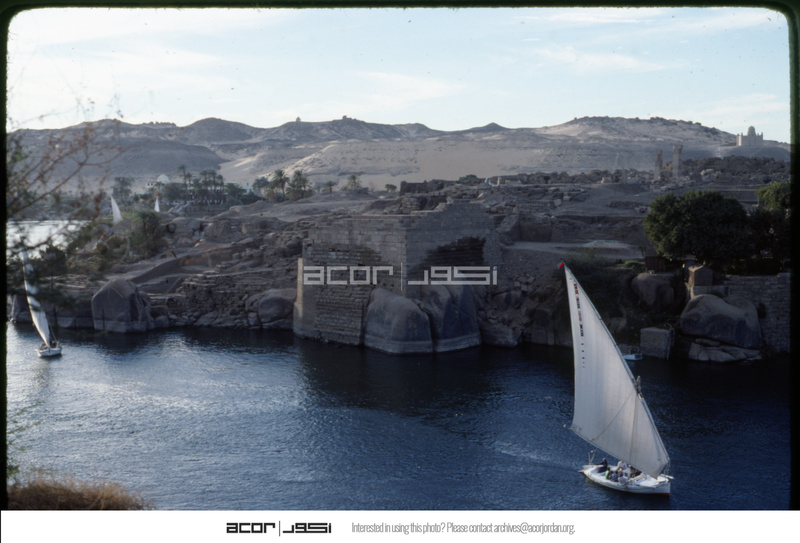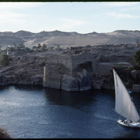 View of feluccas and Elephantine Island with the Mausoleum of Aga Khan in the distance