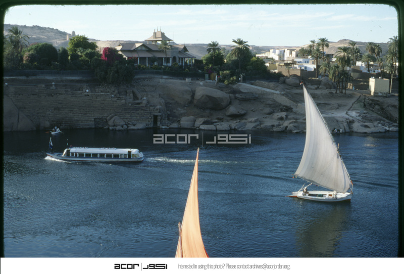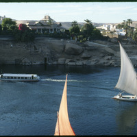 View of feluccas on the Nile at Aswan with Elephantine Island