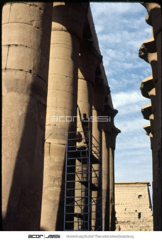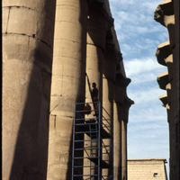 Luxor Temple, worker on scaffolding on Grand Colonnade