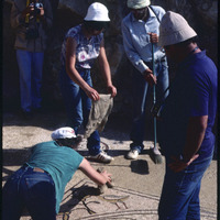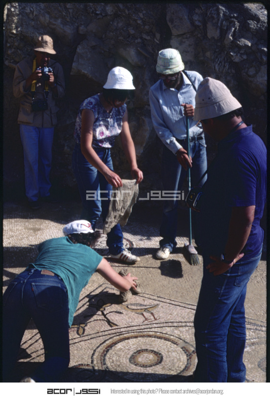 Cleaning mosaic floor at Mount Nebo