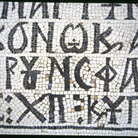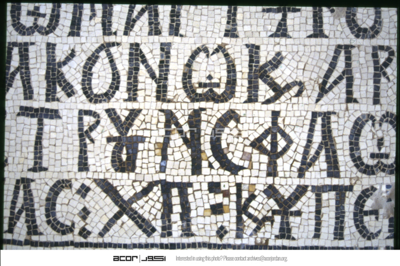 Umm al-Rasas - Detail of Greek inscription in mosaic in Church of St. Stephen