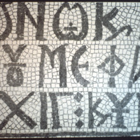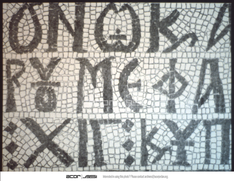 Umm al-Rasas - Detail of Greek inscription in mosaic in Church of St. Stephen