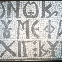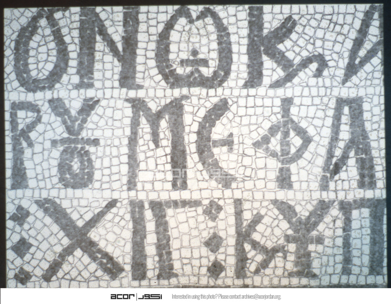 Umm al-Rasas - Detail of Greek inscription in mosaic in Church of St. Stephen