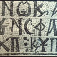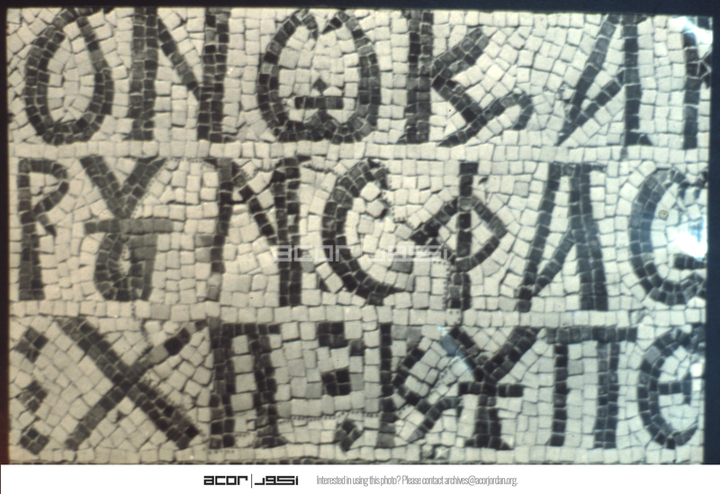 Umm al-Rasas - Detail of Greek inscription in mosaic in Church of St. Stephen