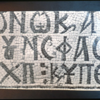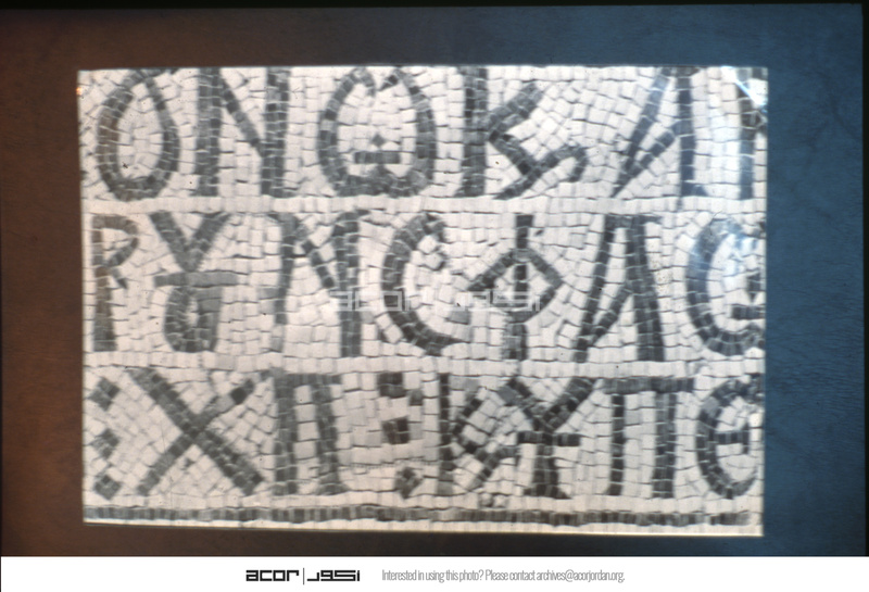 Umm al-Rasas - Detail of Greek inscription in mosaic in Church of St. Stephen