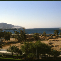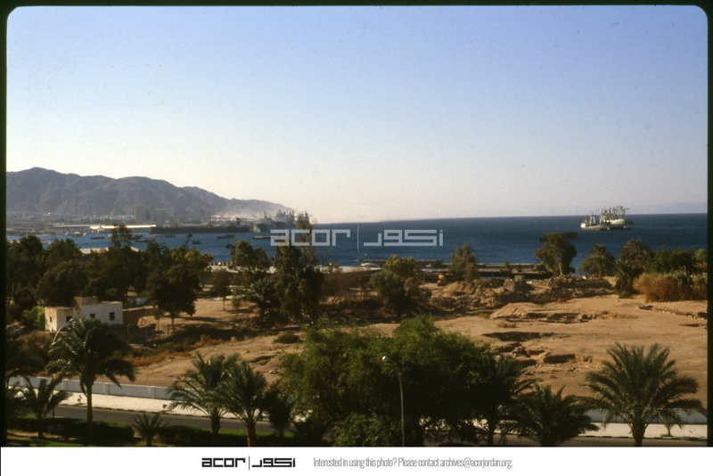 View over Ayla archaeological site with Gulf of Aqaba with container ships