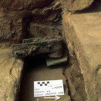 Cu alloy door hinge. View to west. *** 21 to 23 W/out board. - Sq. K3. Loci 25A/FN3, 25, & 26.