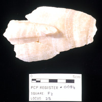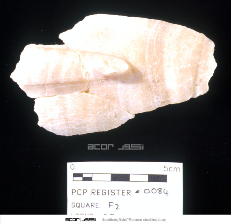- Alabaster vessel frag. - Sq. F2. Studio. Locus 25/Pail66. Reg PCP#.0084.