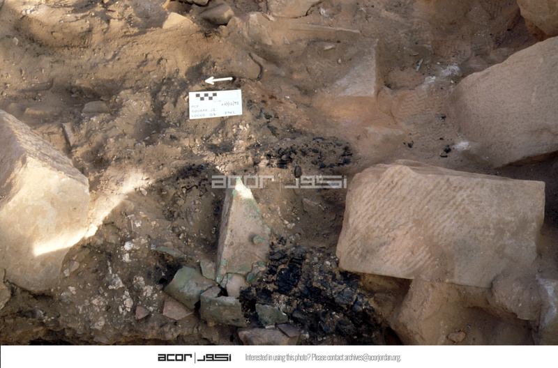 - Cu/Cu alloy door hinge in-situ. View to east. - Sq. J2. Locus 07 / FN1.