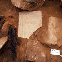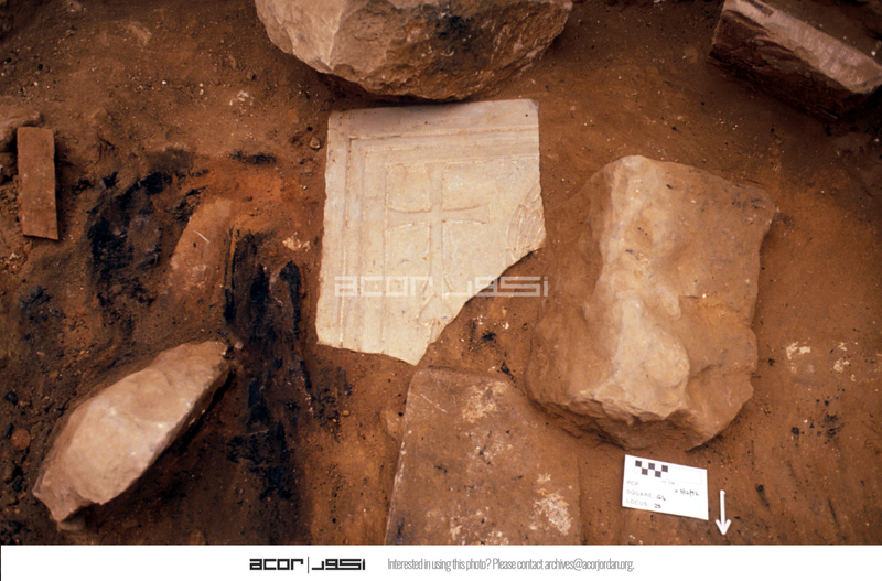 - Marble w/cross. In-situ. View to north. - Sq. G4. Locus 25.