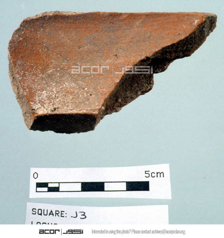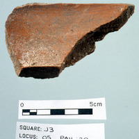 - Sherd with plaster. Pre-cleaning. Obverse side. Sq. J3. Studio. Locus 05/Pail.
