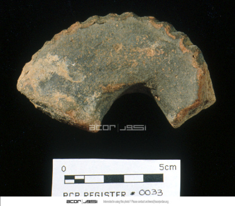 - Pottery ibex horn(frag). Side view. - Sq. H4. Studio. Locus 00/Pail 01. Reg #PCP.0033.