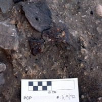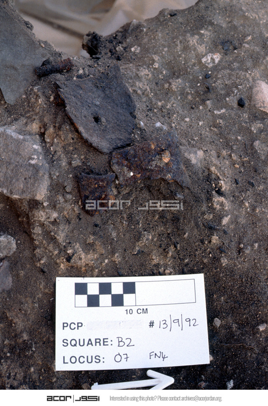 Close-up view to west. Iron piece in-situ. - Sq. B2. Locus 07/FN4.
