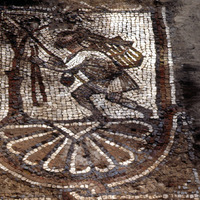 Sq. B1. Close up of mosaic depicting a fowler and his falcon for publication.