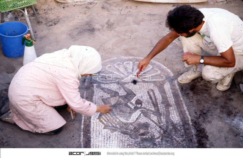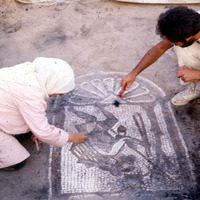 Tom & Fatma cleaning off mosaic in B1 for photograph. - Sq. B1.