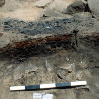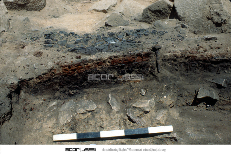 - View to east. Excav. Of fallen burned wooden beam. Roll 2 - 30. - Sq. B1. Locus 7.