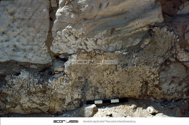 View to south. After cleaning and before consolidation of wall plaster during excavation. Roll 2 - 28. - Sq. A1. North face of Wall A.