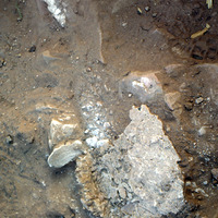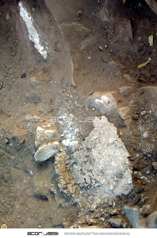 - View to west. Before velatura and lifting of fragments. Roll 2 - 22. - Sq. B1. Locus 7. Wall plaster fragments in soil.