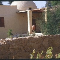 Home in Tunis village illustrating rounded bottom pan in stand and illustrating hospitality (water available for passersby)