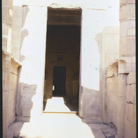 Top level [opened in 2001] of Hetshepsut's temple with sun directly onto statues inside Osirirs