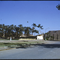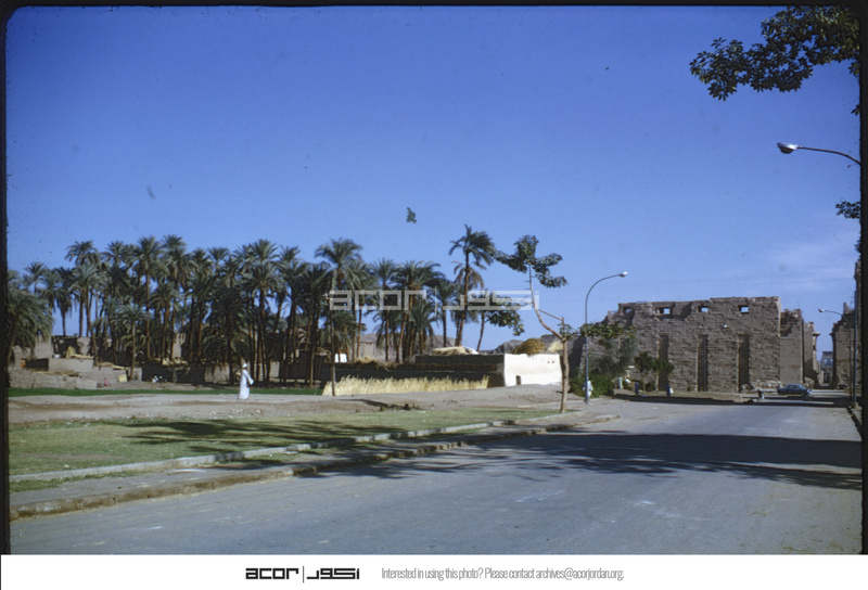 Looking east at north pylon of Karnak Temple and typical village
