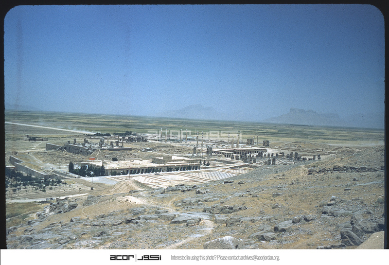 From SE: left Temples of Xerxes, then Darius, Ataxerxes, Apadana, museum, court; right treasury, 100 column hall, hazy background where black stone from