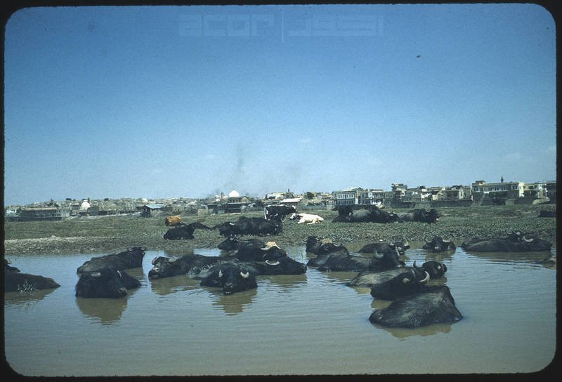 Buffalo in Tigris, Mosul in bkgd W, leaning mosque in bkgd