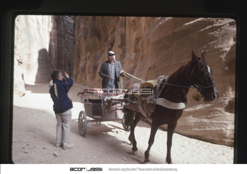 - Bedouin man with horse-drawn carriage posing for Valerie Hane in the Siq