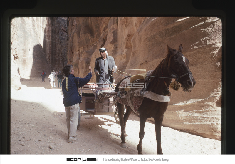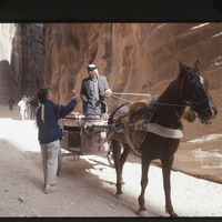 - Bedouin man with horse-drawn carriage posing for Valerie Hane in the Siq