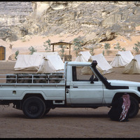 - Bedouin man checking truck tires at campsite close of the Campsite in Wadi Rum
