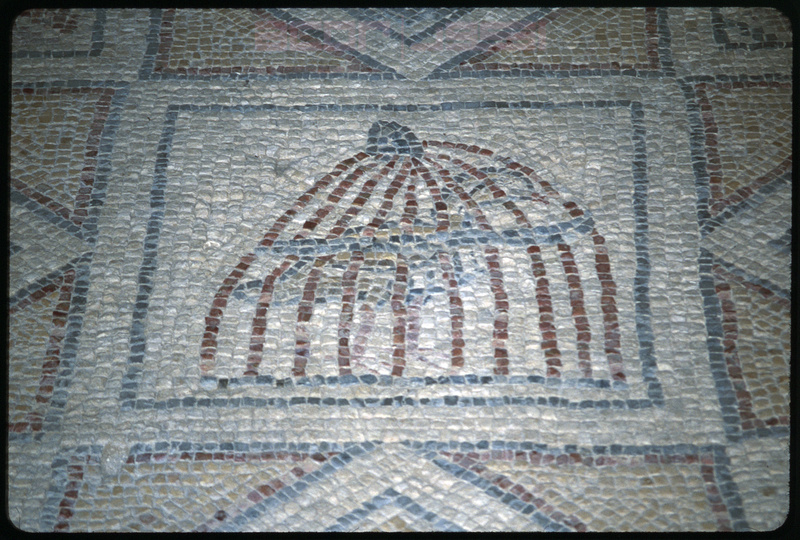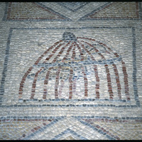 - Mosaic floor - depicting bird in a cage from Chapel of the Twal family (Bait Al Twal) in Madaba Archaeological Park at Madaba