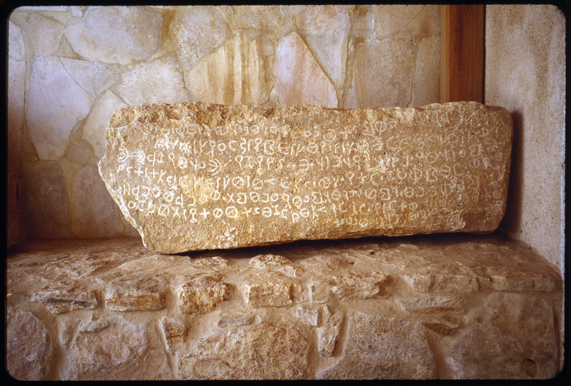 Greek inscription carved on stone displayed in Madaba Archaeological Park at Madaba