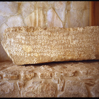 - Greek inscription carved on stone displayed in Madaba Archaeological Park at Madaba