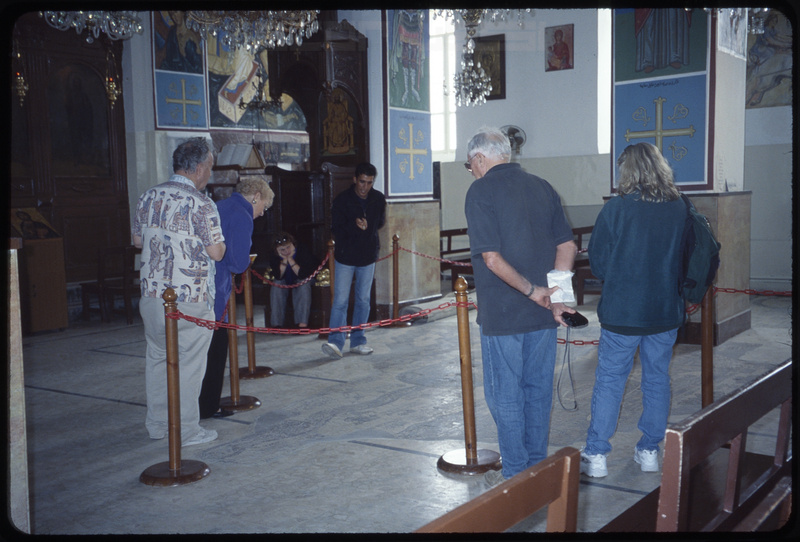 - Tourist's with a guide looking to the Madaba Mosaic Map in St. George's Church