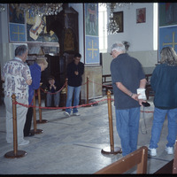 Tourist's with a guide looking to the Madaba Mosaic Map in St. George's Church