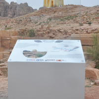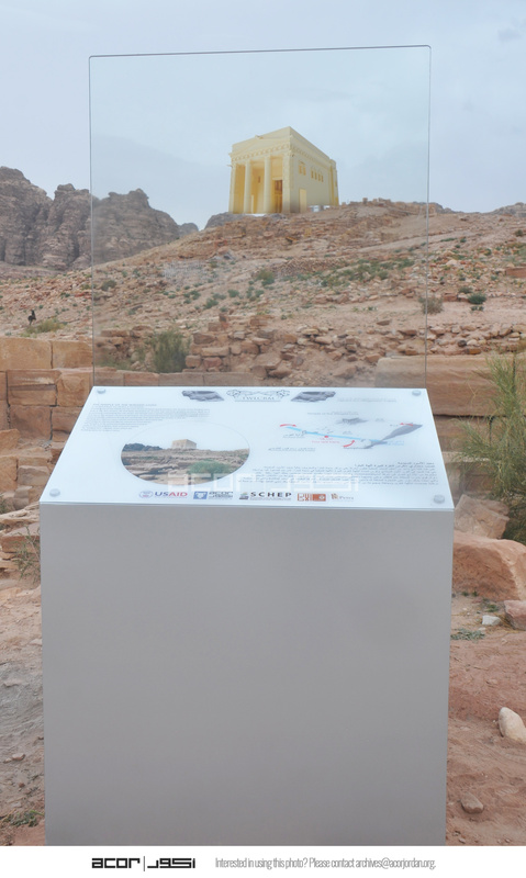 - Jordan. Petra, Temple of the Winged Lions, glass sign installed on Roman Street below the temple, showing Augmented Reality (AR) presentation of the temple in the landscape
