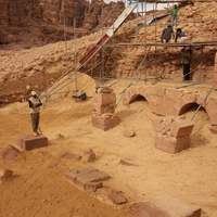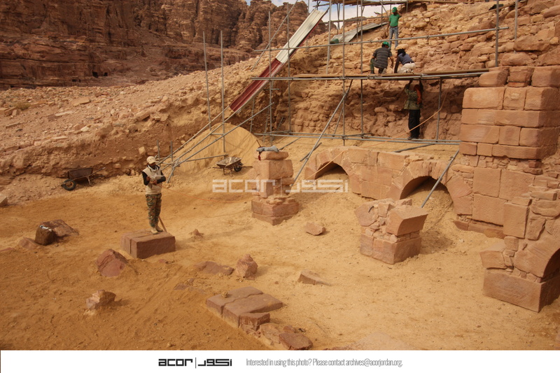 - Jordan. Petra, Temple of the Winged Lions, installation / adjustment of scaffolding by PDTRA staff after completion of backfilling operation in southwest quadrant