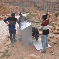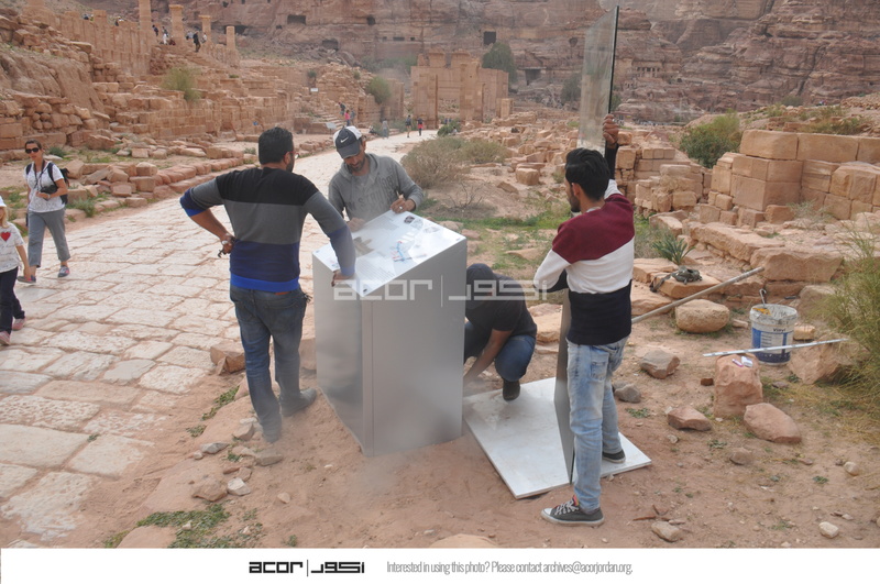 Jordan. Petra, Temple of the Winged Lions, glass sign being installed on Roman Street below the Temple of the Winged Lions by TWL team and staff of Al Asri Modern Advertising Center