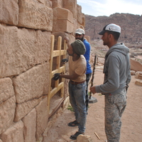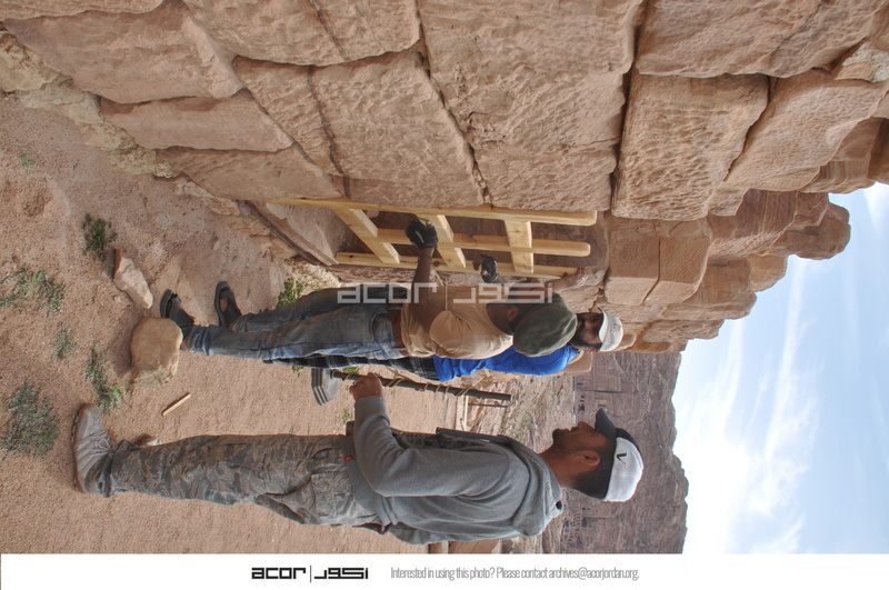- Jordan. Petra, Temple of the Winged Lions, team members installing wooden fence to block entrance-way in front of temple