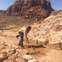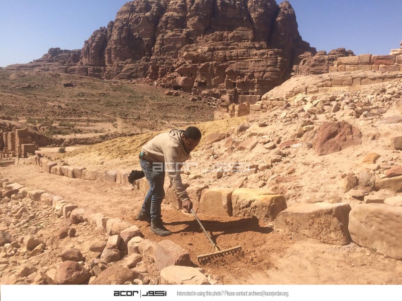 - Jordan. Petra, Temple of the Winged Lions, team member grading new ‘short-cut’ path between temple and lapidarium
