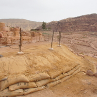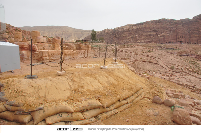 - Jordan. Petra, Temple of the Winged Lions, first stage of cella path build-out completed, fence posts prepared